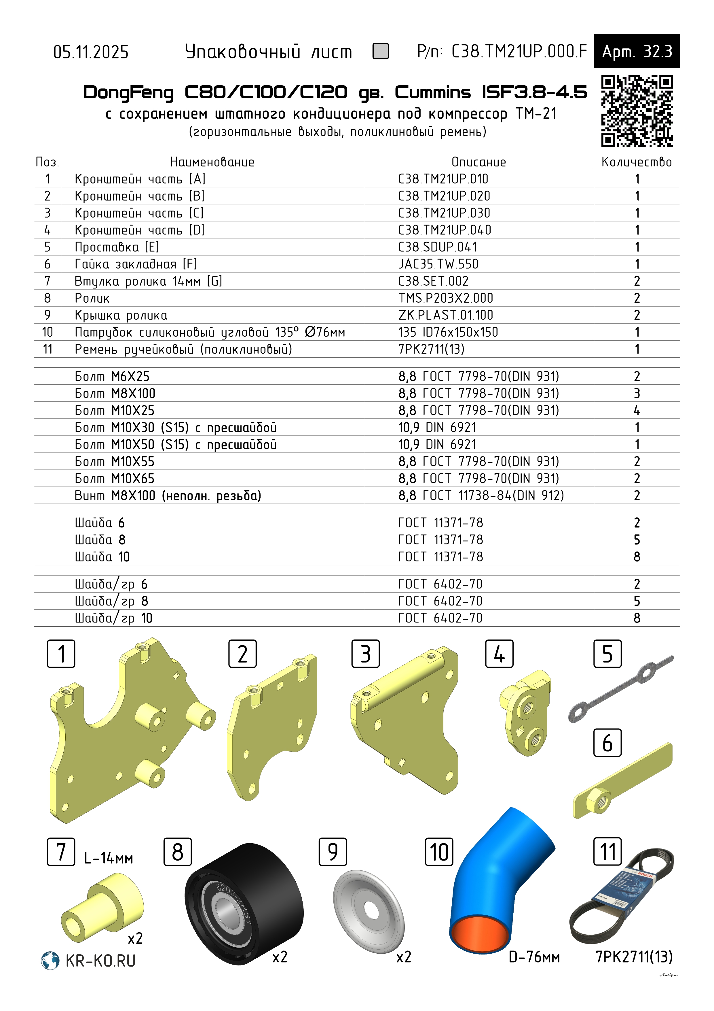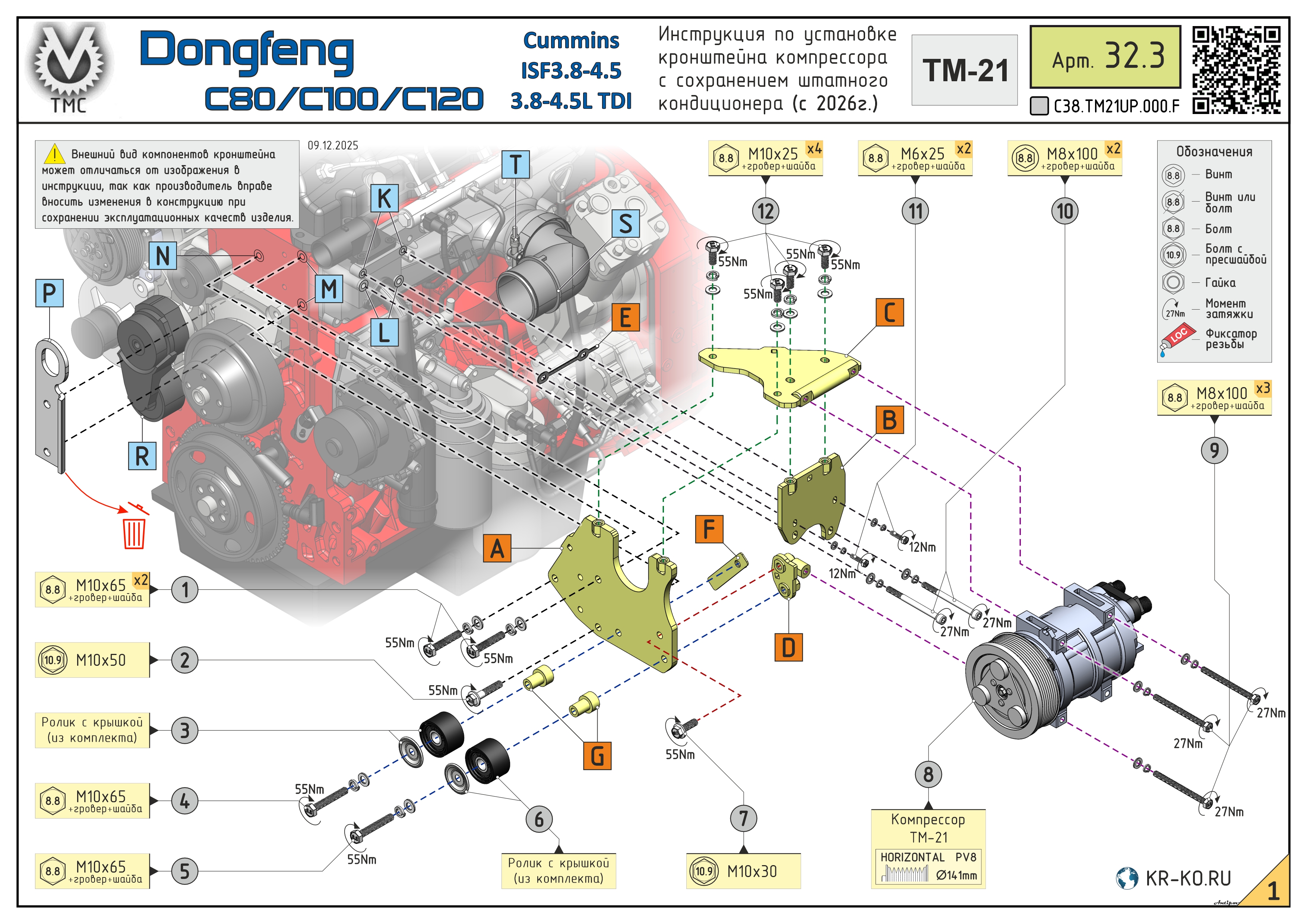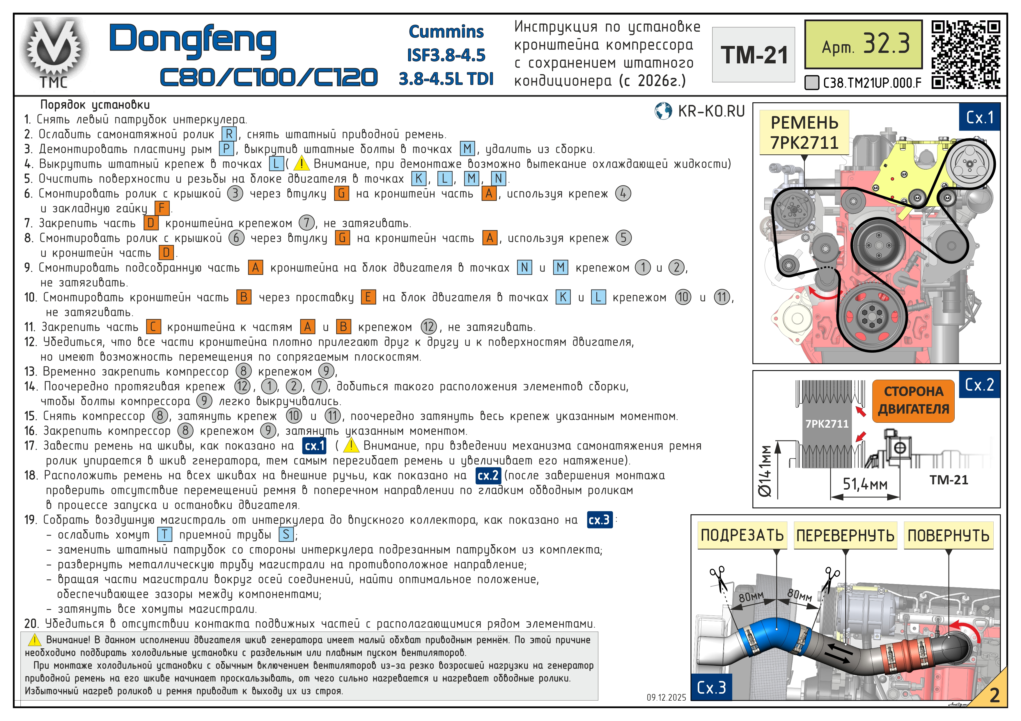 Монтажный комплект для установки компрессора типа Valeo TM-21 холодильно-отопительной установки на автомобиль DongFeng 80-120 с двигателем ISF3.8 c сохранением штатного кондиционера. Включает в себя кронштейн компрессора, высокопрочный крепеж для монтажа, приводной ремень (по договоренности с заказчиком), схему установки, картонную упаковку. Цена на монтажный комплект указана без учета ремня, полную стоимость уточняйте у менеджера.