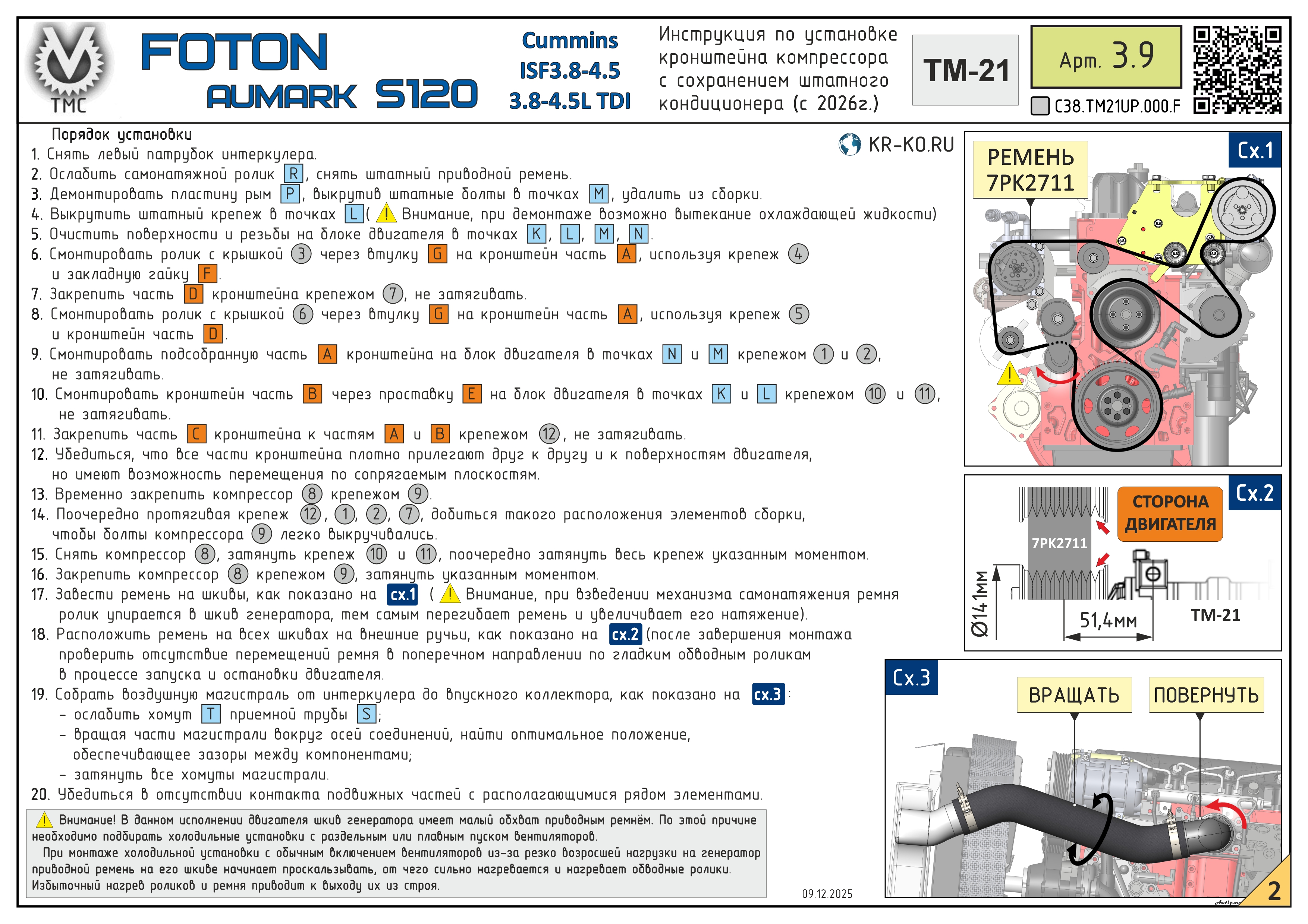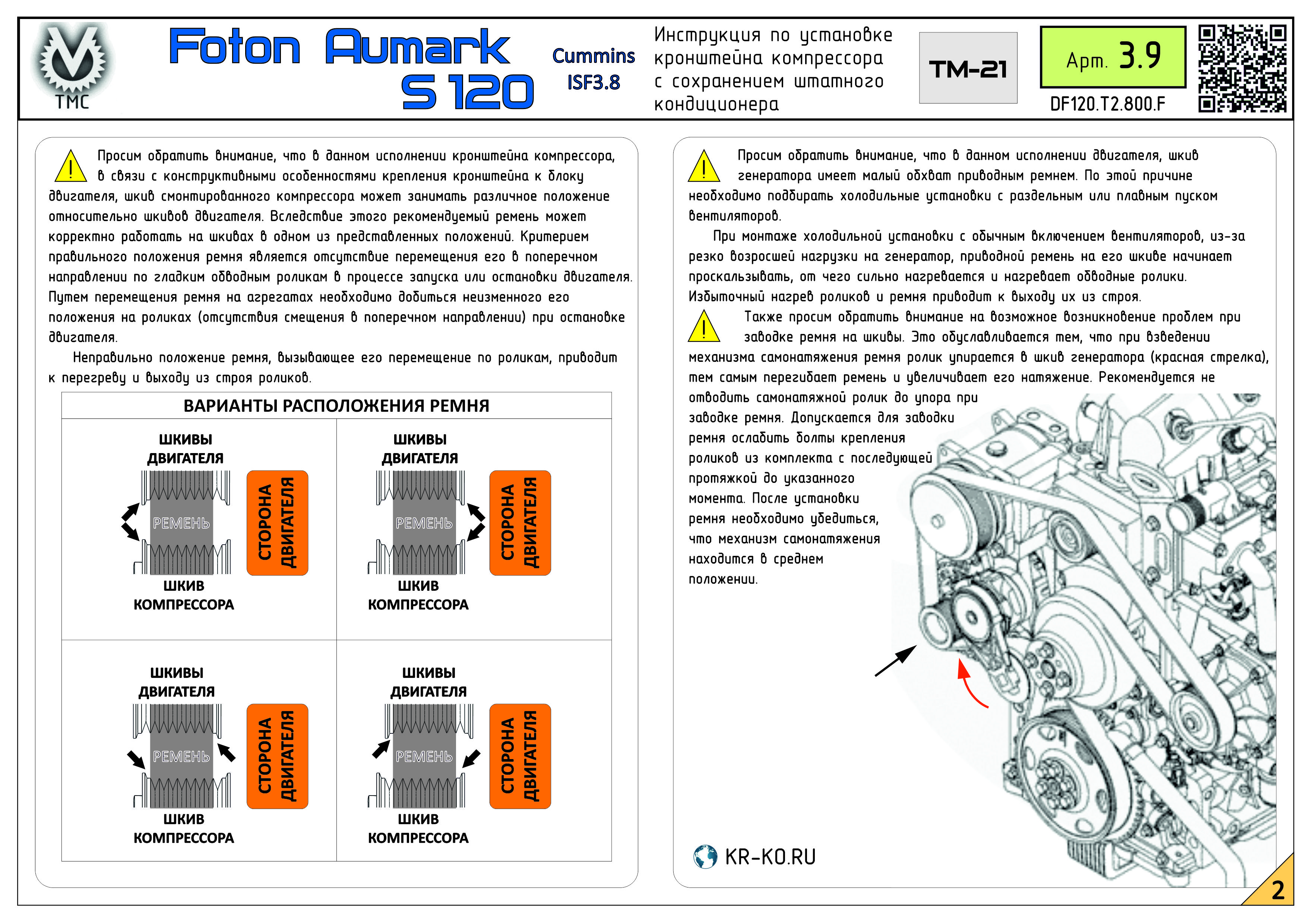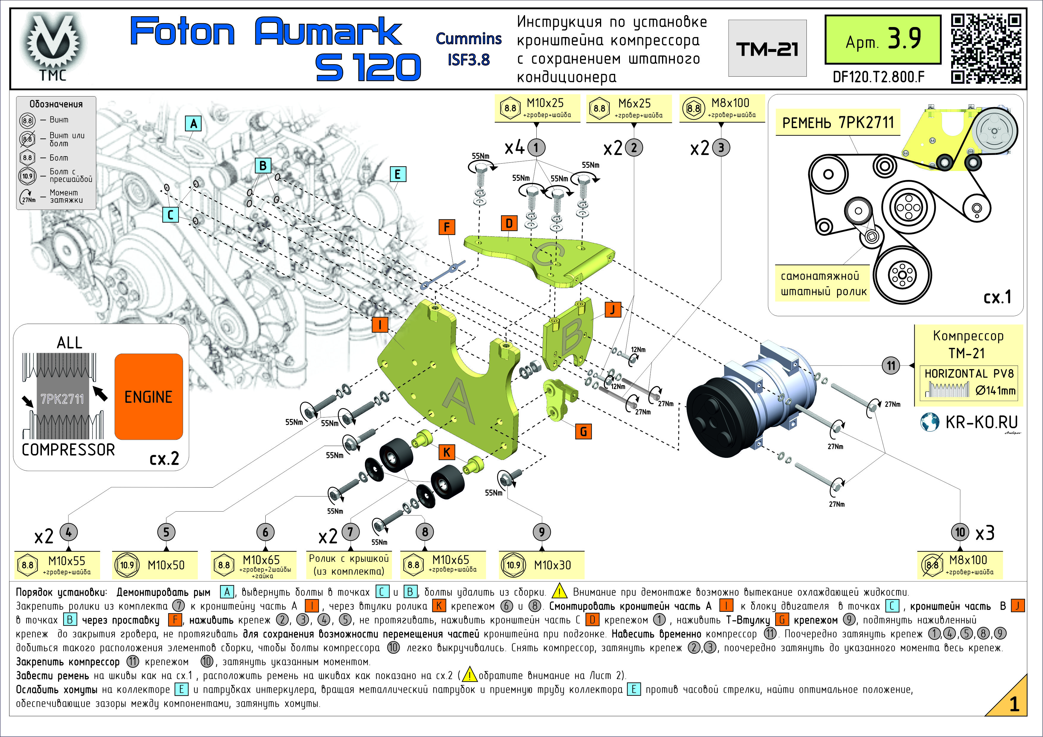Монтажный комплект для установки компрессора типа Valeo TM-21 холодильно-отопительной установки на автомобиль Foton Aumark S120 с двигателем Cummins ISF 3.8 Е5 c кондиционером. Включает в себя кронштейн компрессора, высокопрочный крепеж для монтажа, приводной ремень (по договоренности с заказчиком), схему установки, картонную упаковку. Цена на монтажный комплект указана без учета ремня, полную стоимость уточняйте у менеджера.