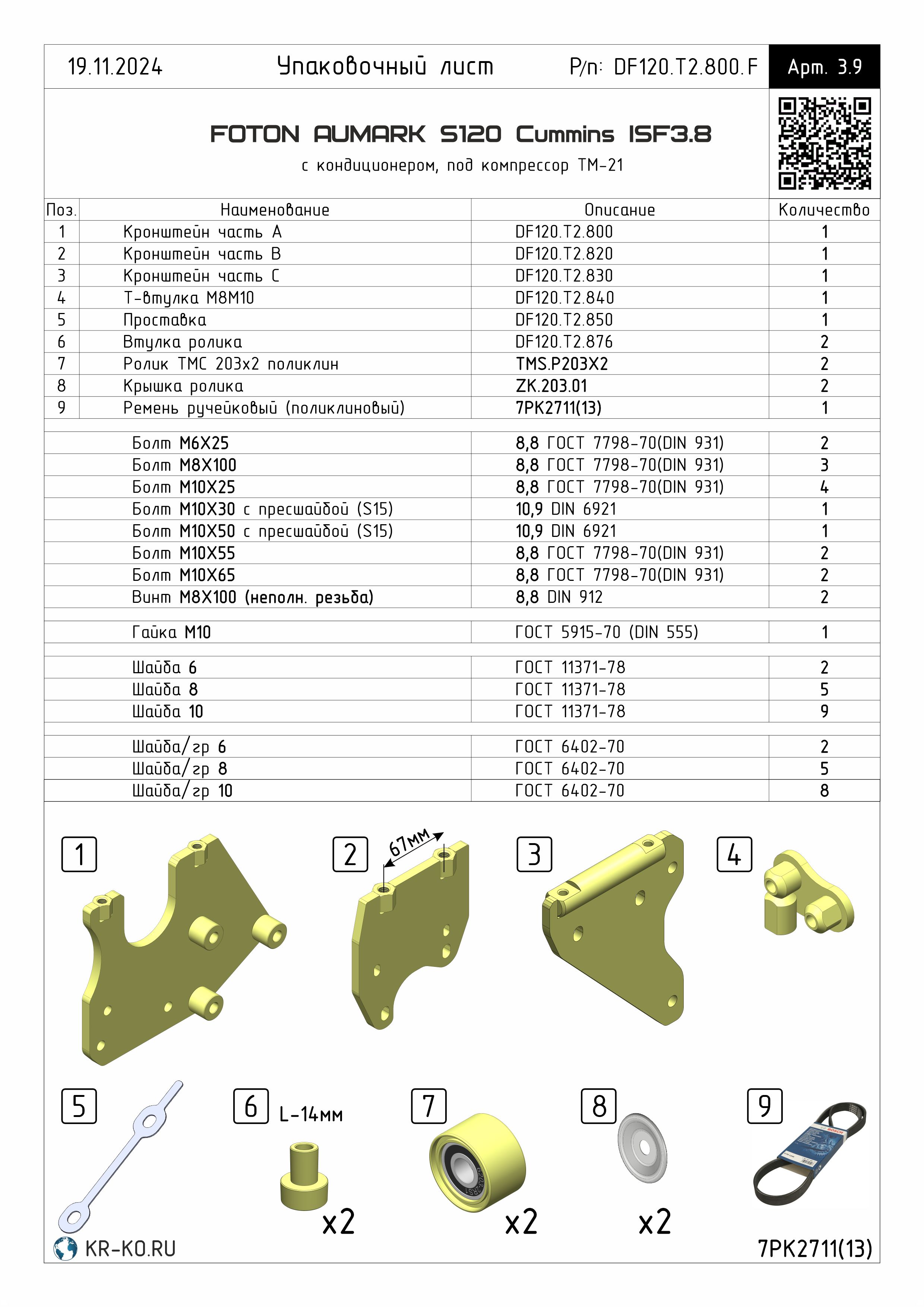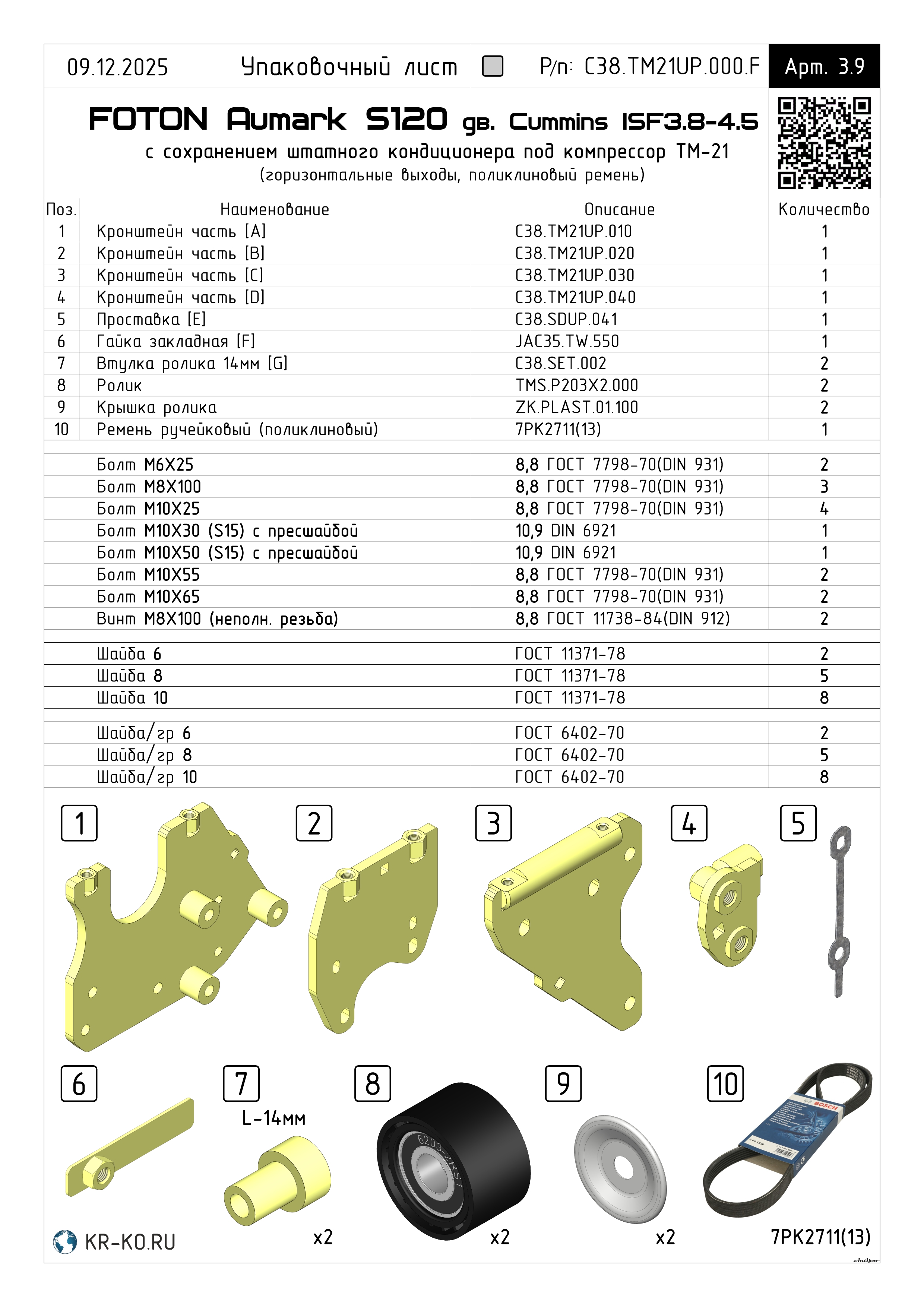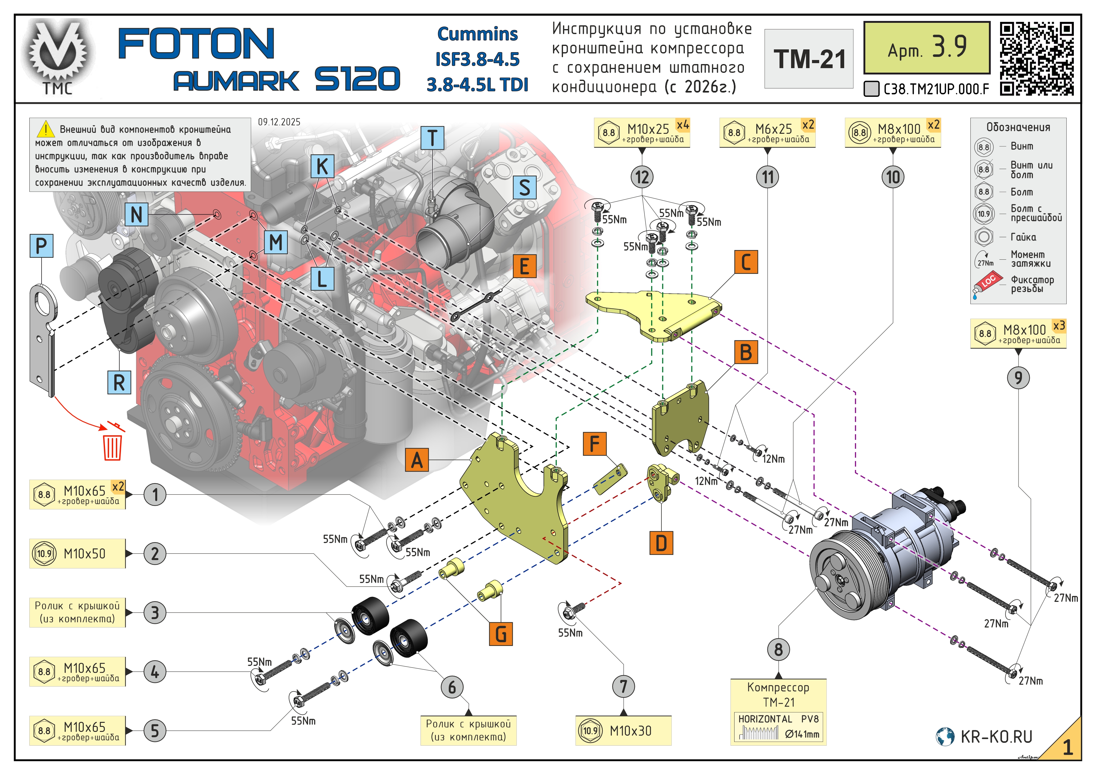 Монтажный комплект для установки компрессора типа Valeo TM-21 холодильно-отопительной установки на автомобиль Foton Aumark S120 с двигателем Cummins ISF 3.8 Е5 c кондиционером. Включает в себя кронштейн компрессора, высокопрочный крепеж для монтажа, приводной ремень (по договоренности с заказчиком), схему установки, картонную упаковку. Цена на монтажный комплект указана без учета ремня, полную стоимость уточняйте у менеджера.