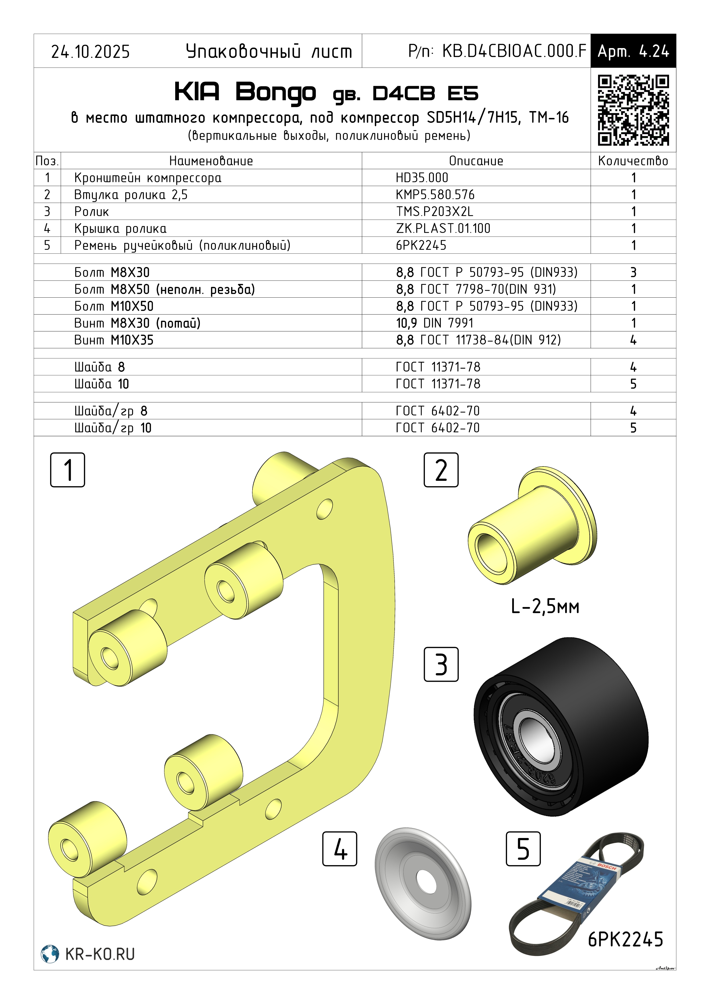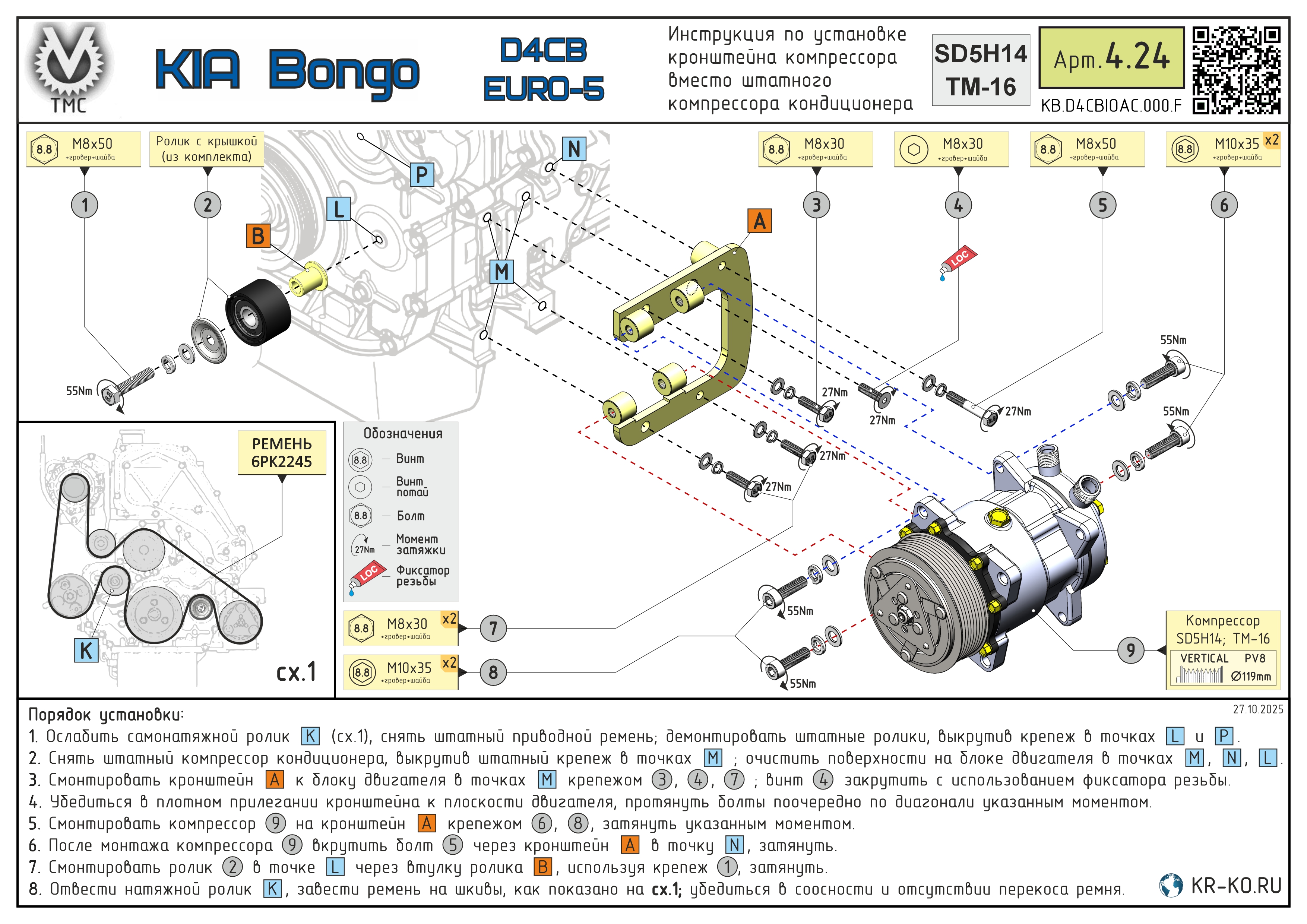 Монтажный комплект для установки компрессора типа Sanden SD 5H14/7H15 (Valeo TM-15, ТМ-16) холодильно-отопительной установки на автомобиль KIA Bongo с двигателем D4CB (без сохранения штатного кондиционера). Включает в себя кронштейн компрессора, высокопрочный крепеж для монтажа, схему установки, картонную упаковку. Цена на монтажный комплект указана без учета ремня, полную стоимость уточняйте у менеджера.