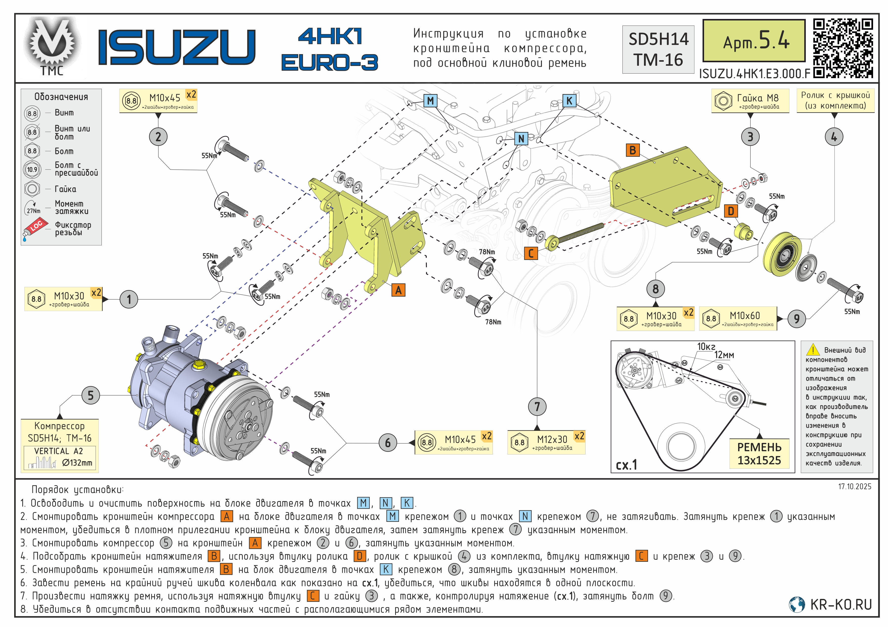 Монтажный комплект для установки компрессора типа Sanden SD 5H14/7H15 (Valeo TM-15, ТМ-16) холодильно-отопительной установки на автомобиль ISUZU с двигателем 4HK1 Е3 (основной ремень клиновой). Включает в себя кронштейн компрессора, высокопрочный крепеж для монтажа, схему установки, картонную упаковку. Цена на монтажный комплект указана без учета ремня, полную стоимость уточняйте у менеджера.