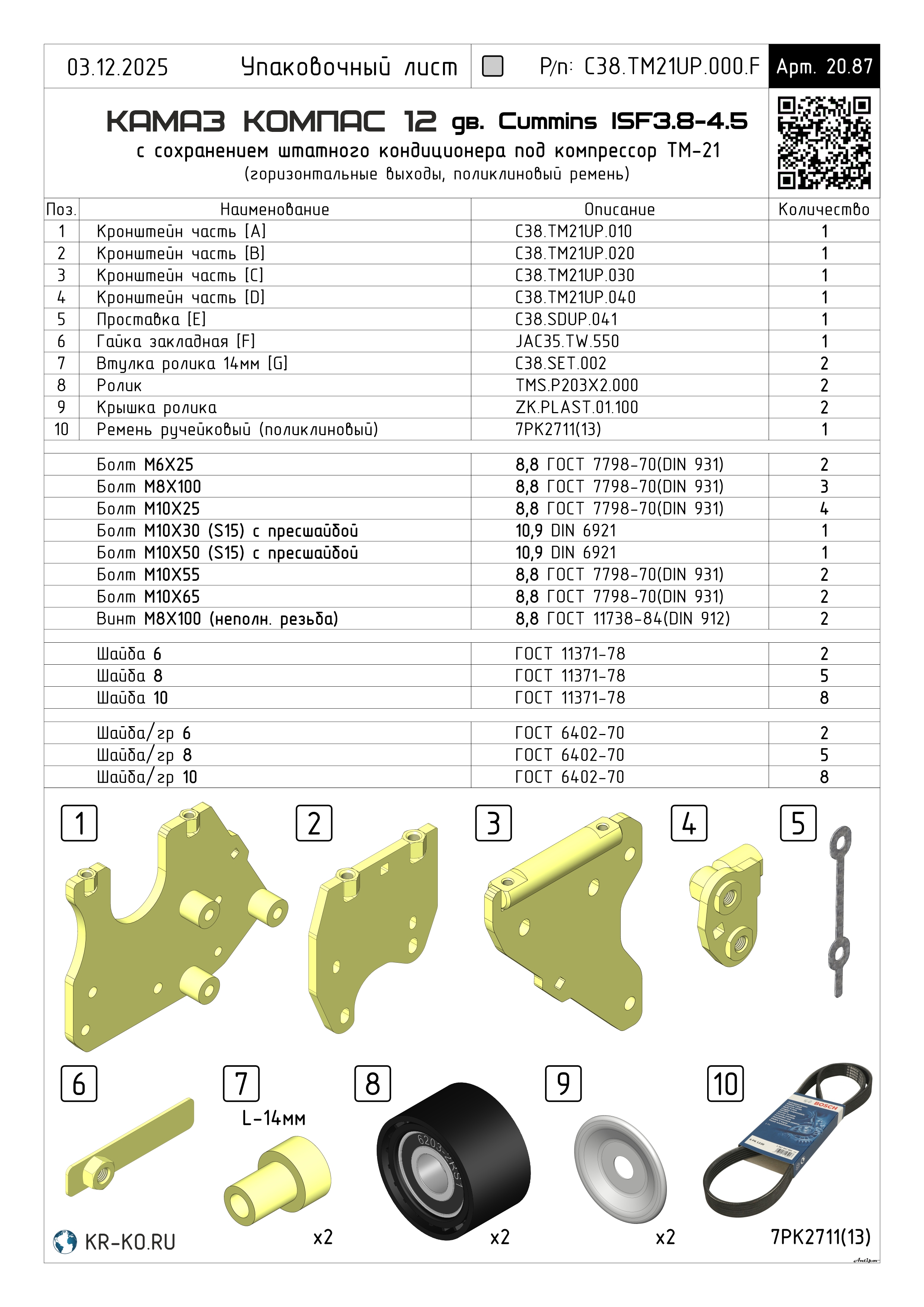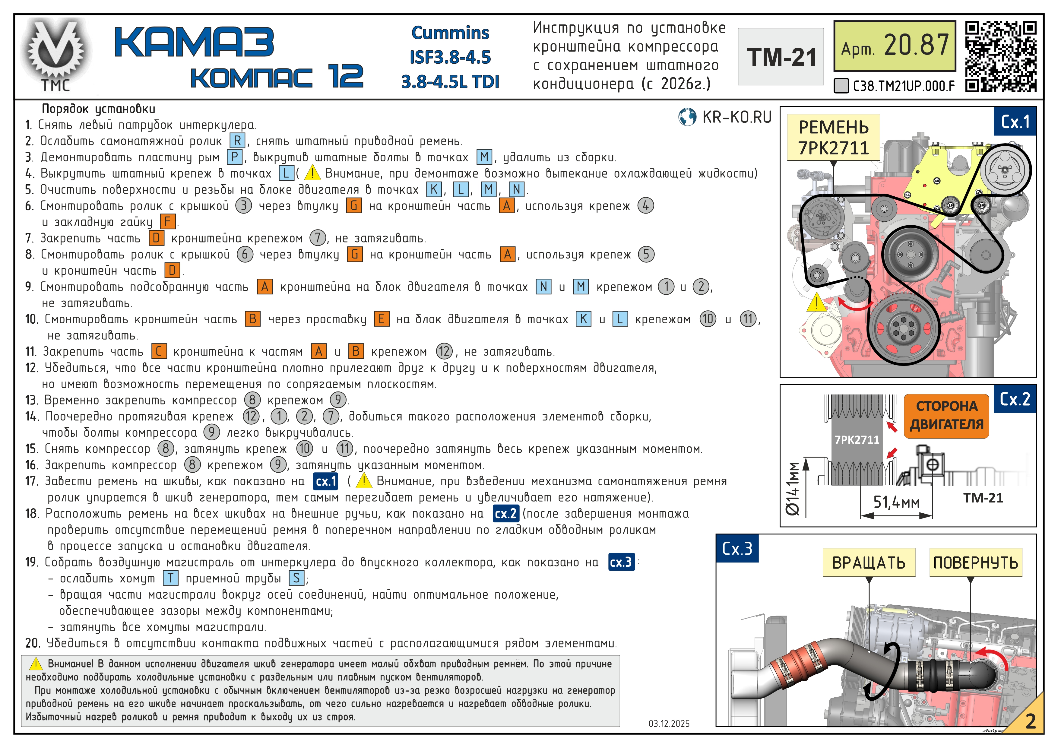 Монтажный комплект для установки компрессора типа Valeo TM-21 холодильно-отопительной установки на автомобиль КАМАЗ КОМПАС 12 с двигателем ISF 3.8 c сохранением штатного кондиционера. Включает в себя кронштейн компрессора, высокопрочный крепеж для монтажа, приводной ремень (по договоренности с заказчиком), схему установки, картонную упаковку. Цена на монтажный комплект указана без учета ремня, полную стоимость уточняйте у менеджера.