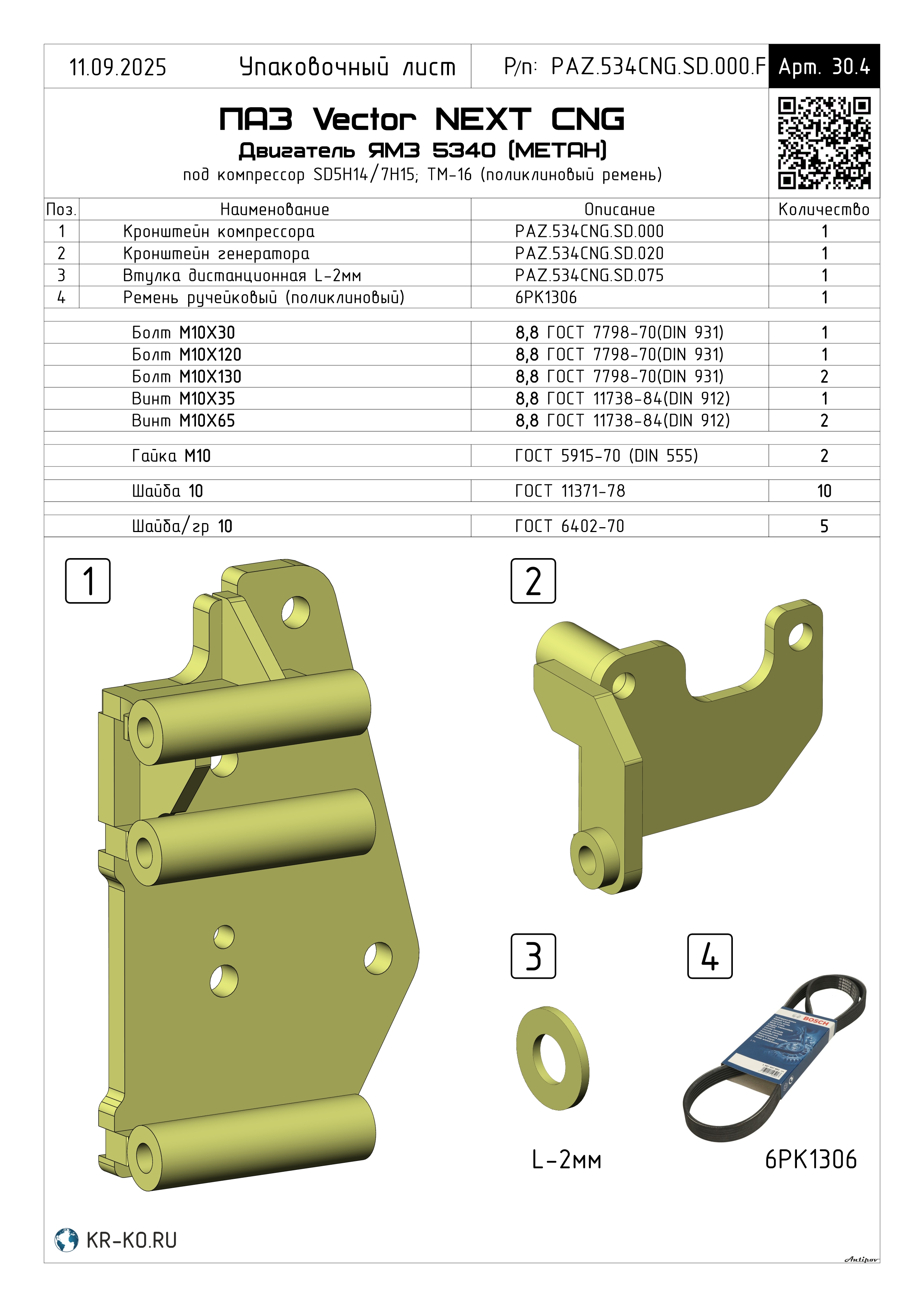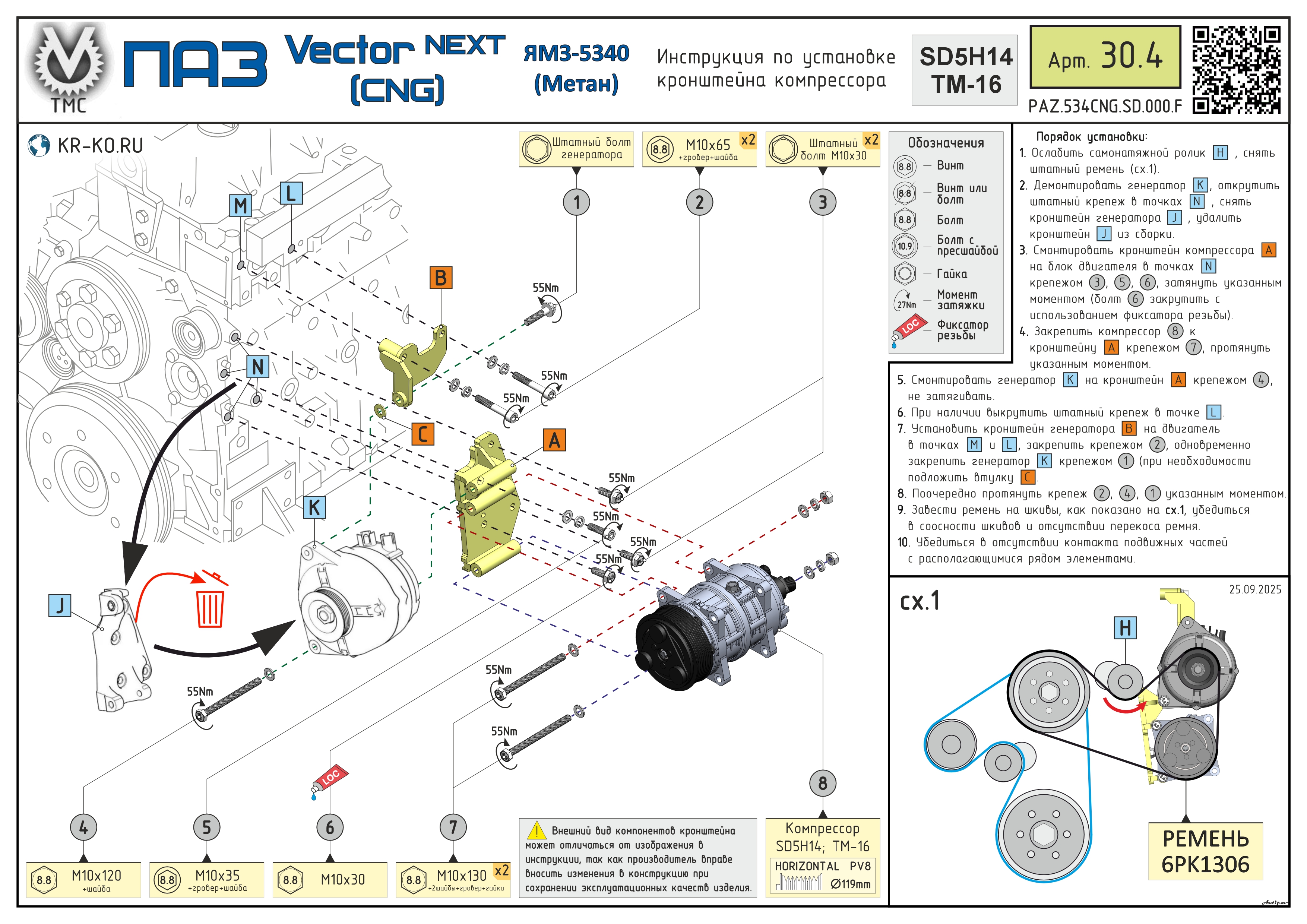 Монтажный комплект для установки компрессора типа Sanden SD5H14/7H15 (Valeo TM-15/TM-16) холодильно-отопительной установки на автомобиль ПАЗ Vector NEXT с двигателем ЯМЗ 5340 CNG (на МЕТАНЕ). Включает в себя кронштейн компрессора, высокопрочный крепеж для монтажа, приводной ремень (по договоренности с заказчиком), схему установки, картонную упаковку. Цена на монтажный комплект указана без учета ремня, полную стоимость уточняйте у менеджера.